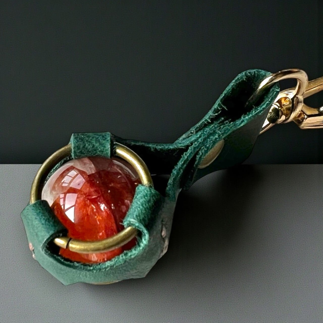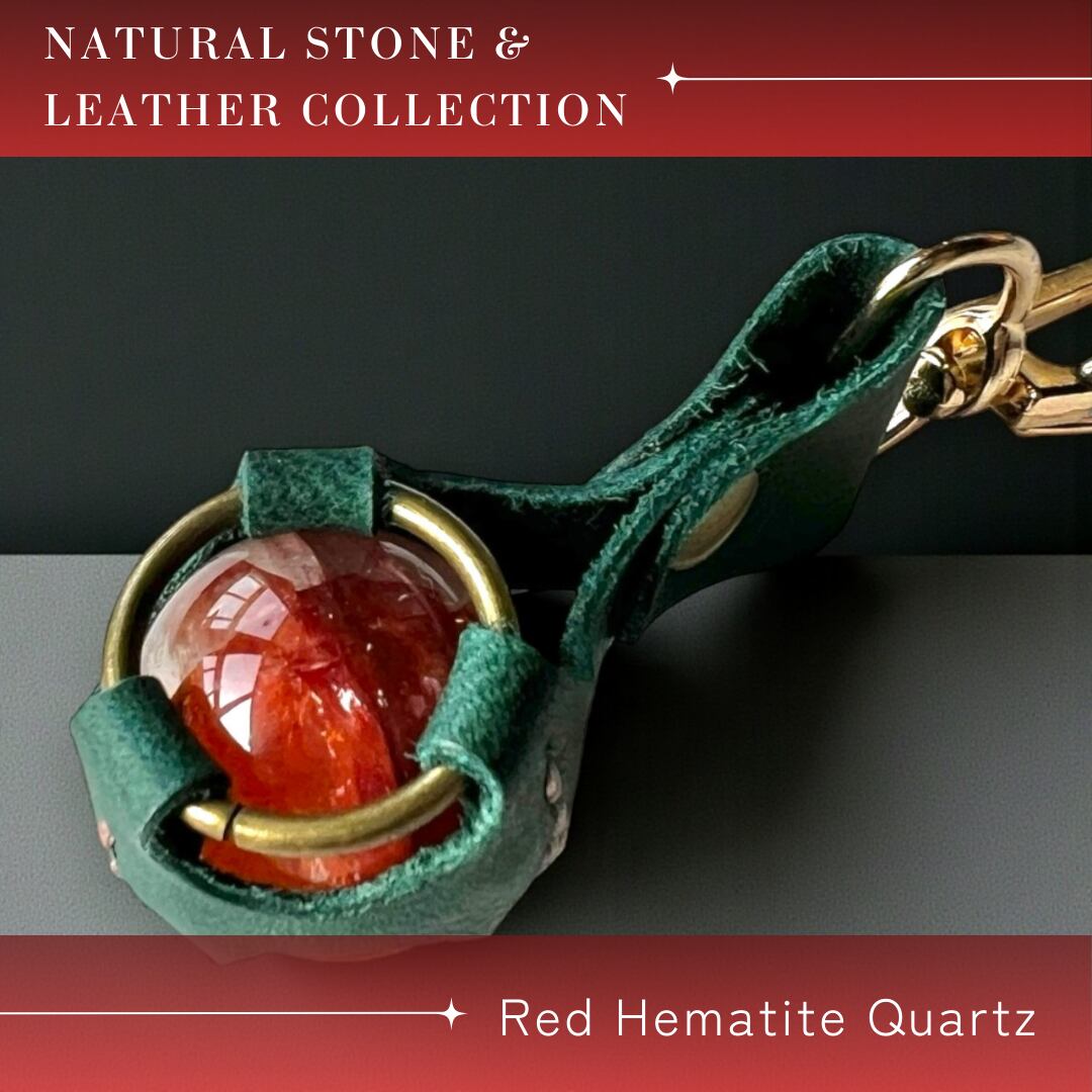 光の角度で表情が変わる天然石を、手縫いレザーで丁寧に保護。