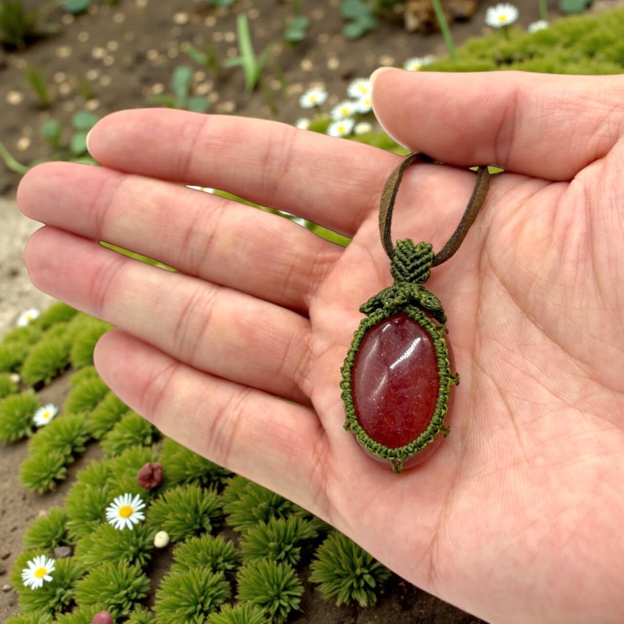 苺モチーフの一点もの。アフリカンレッドアベンチュリンを、緑のマクラメで果実みたいに包んだチョーカーです。甘すぎず派手すぎない、ピンク寄りのやわらかな赤が胸元に小さな差し色を作ります。