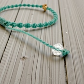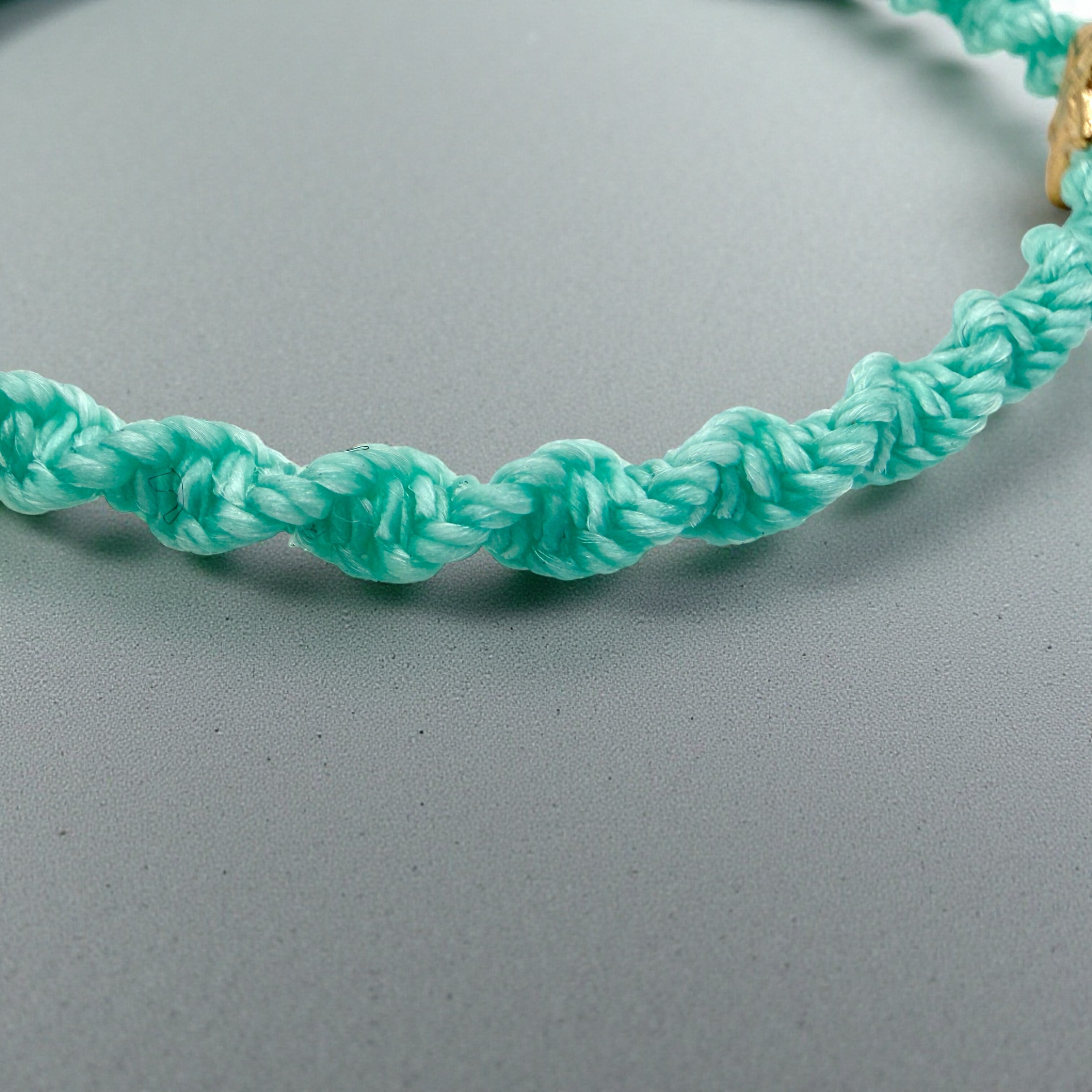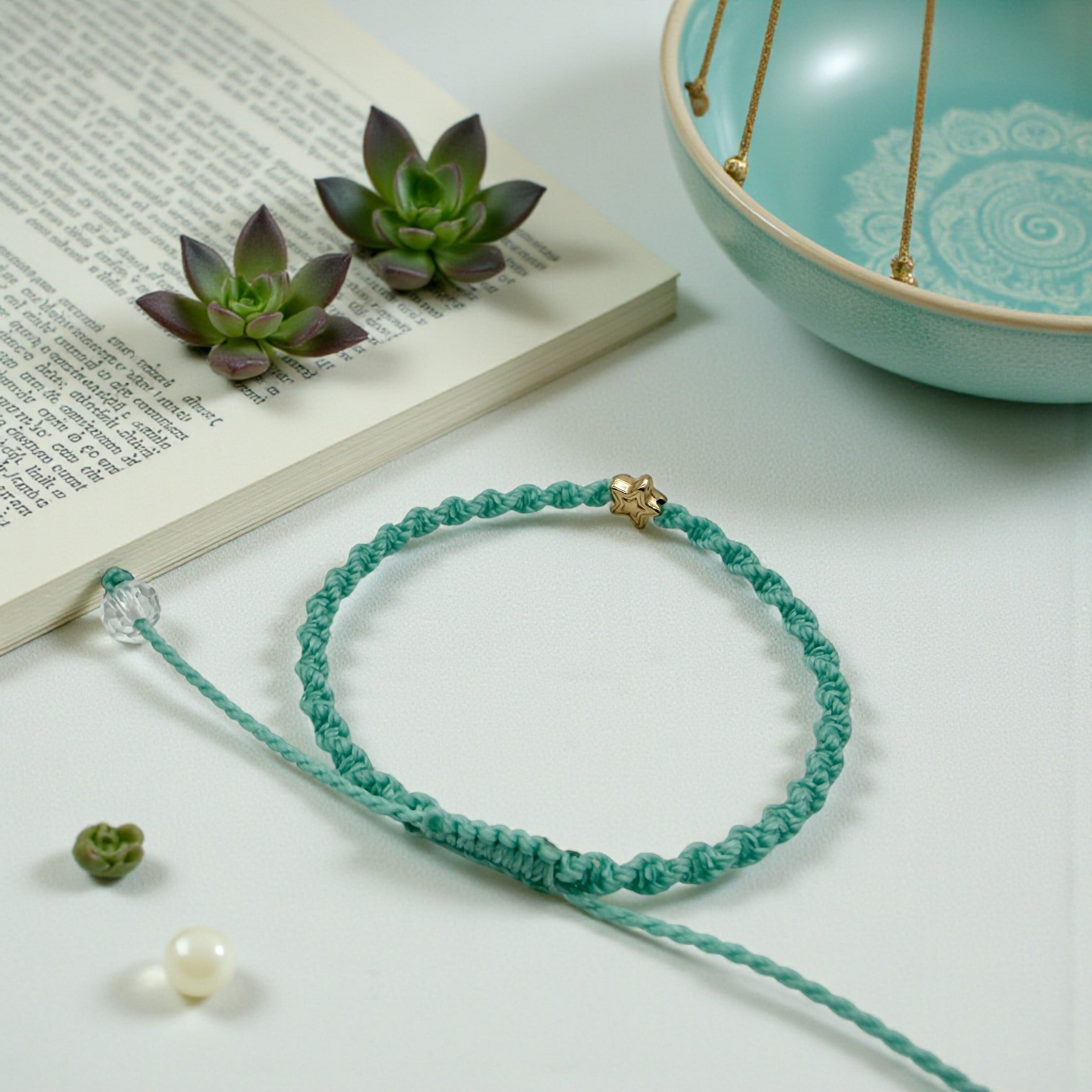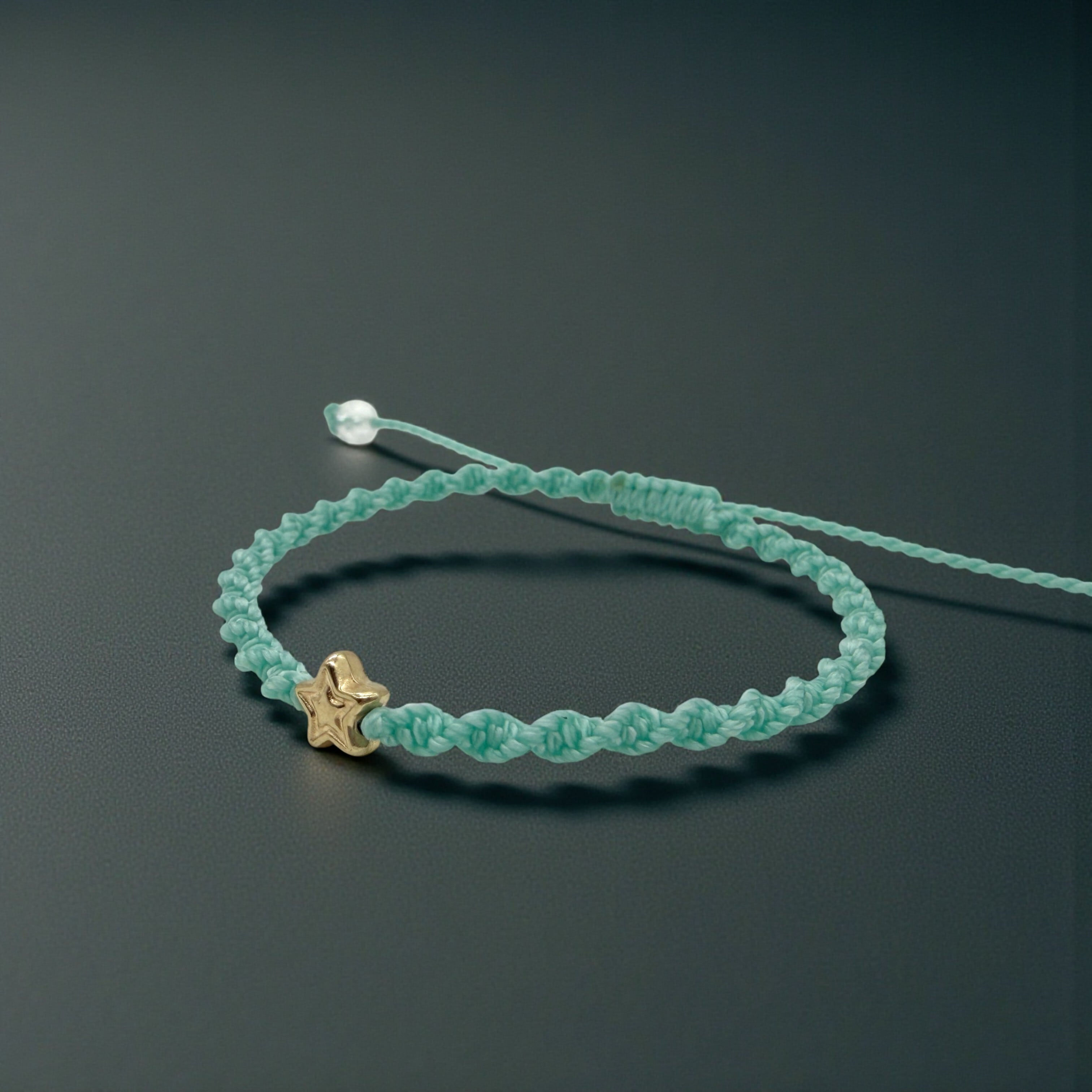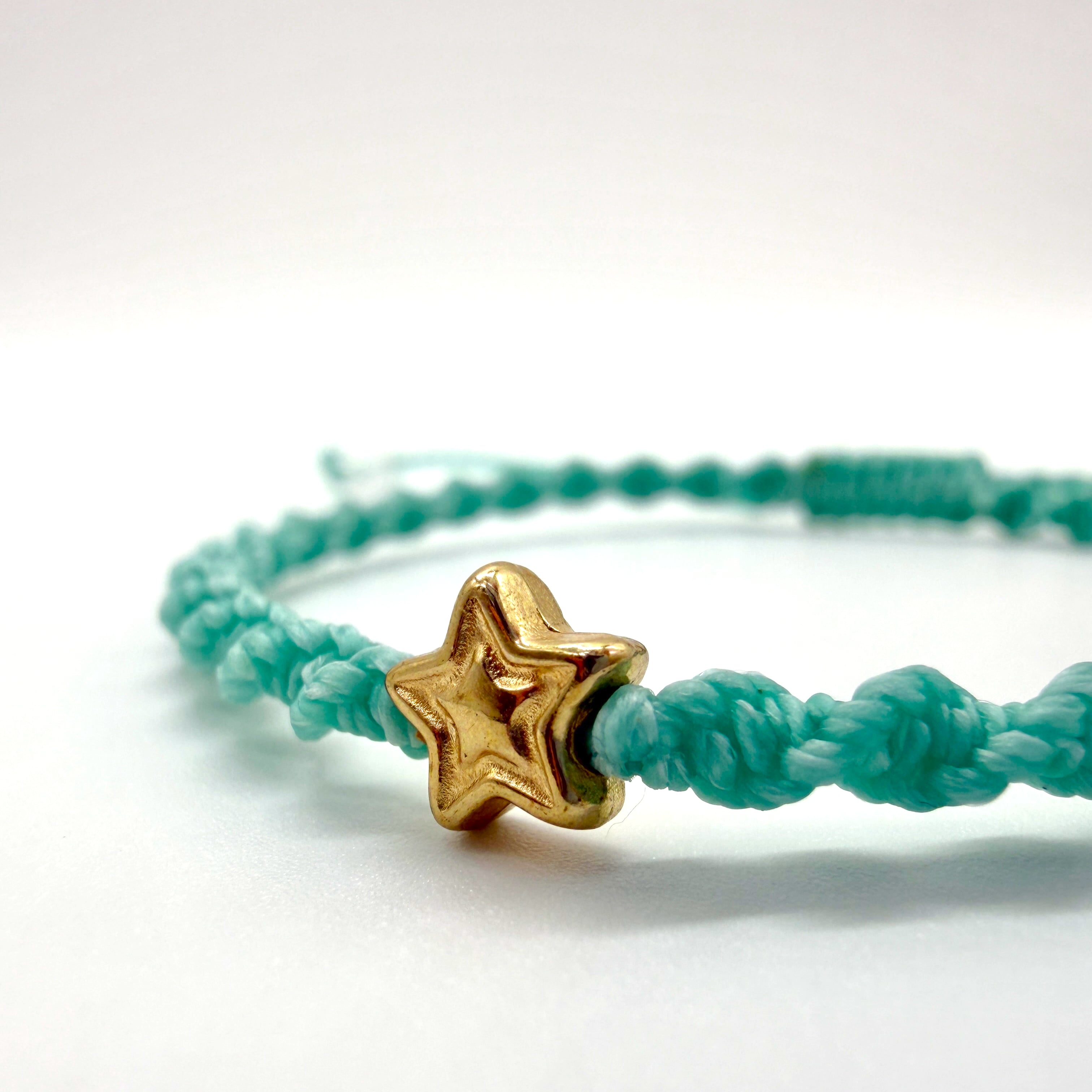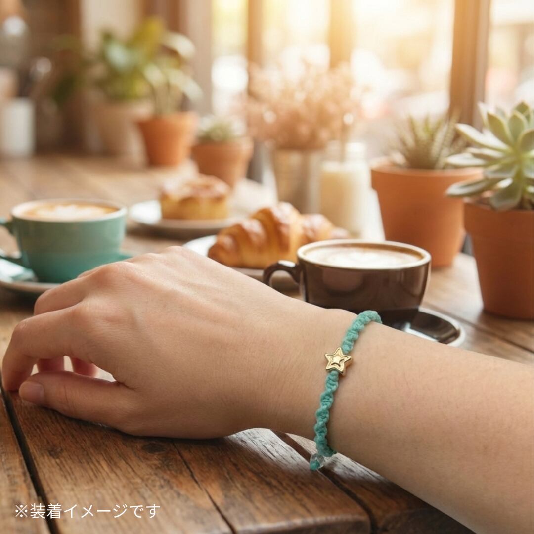 やわらかなミントグリーンの紐に、小さな星のきらめきを添えた編みブレスレットです。