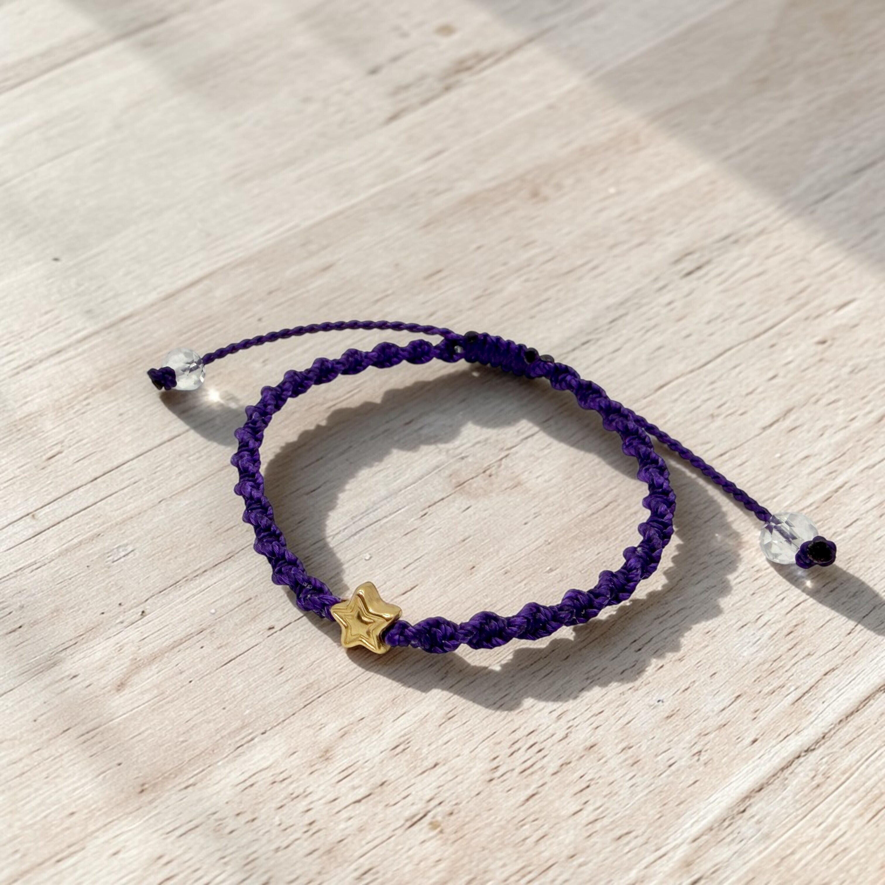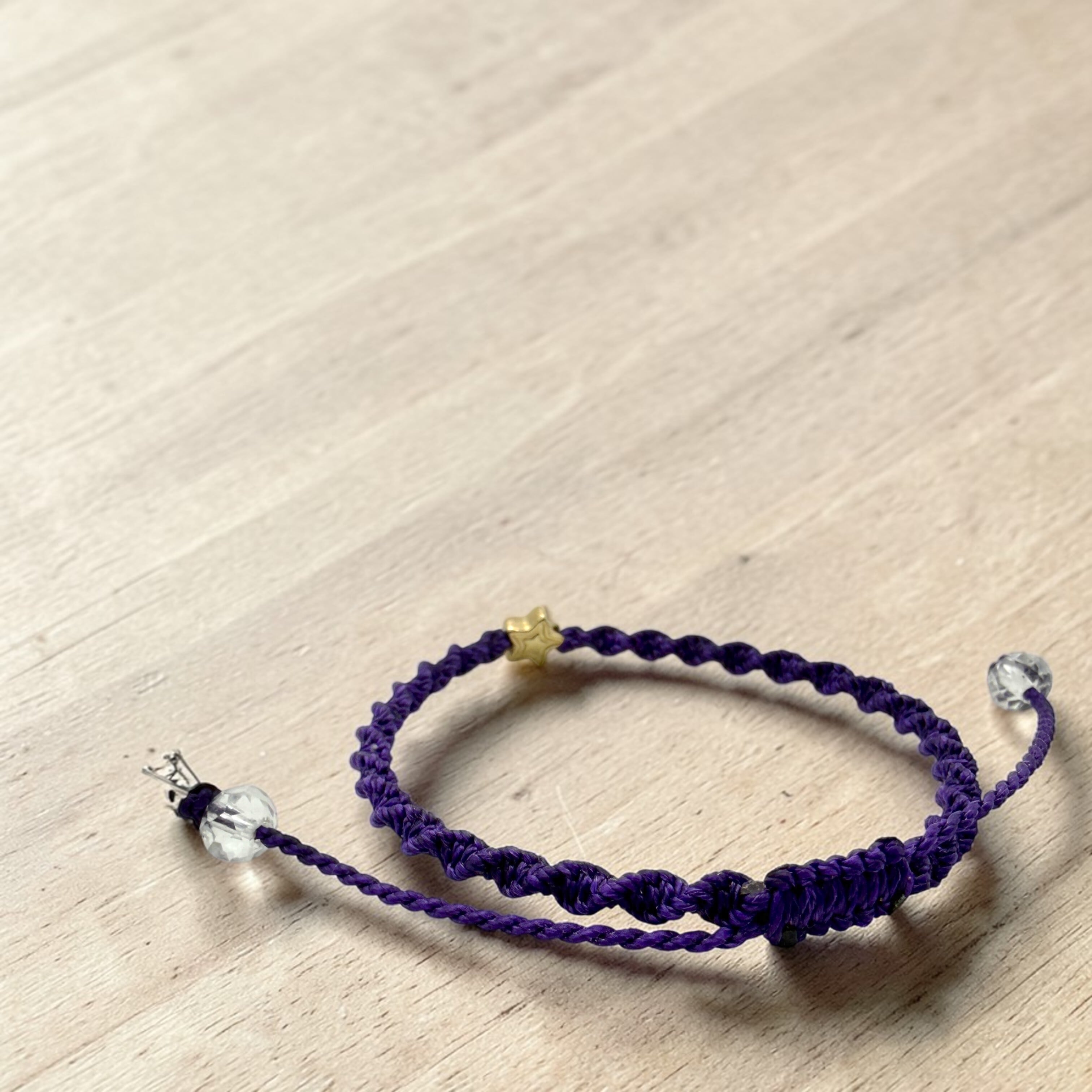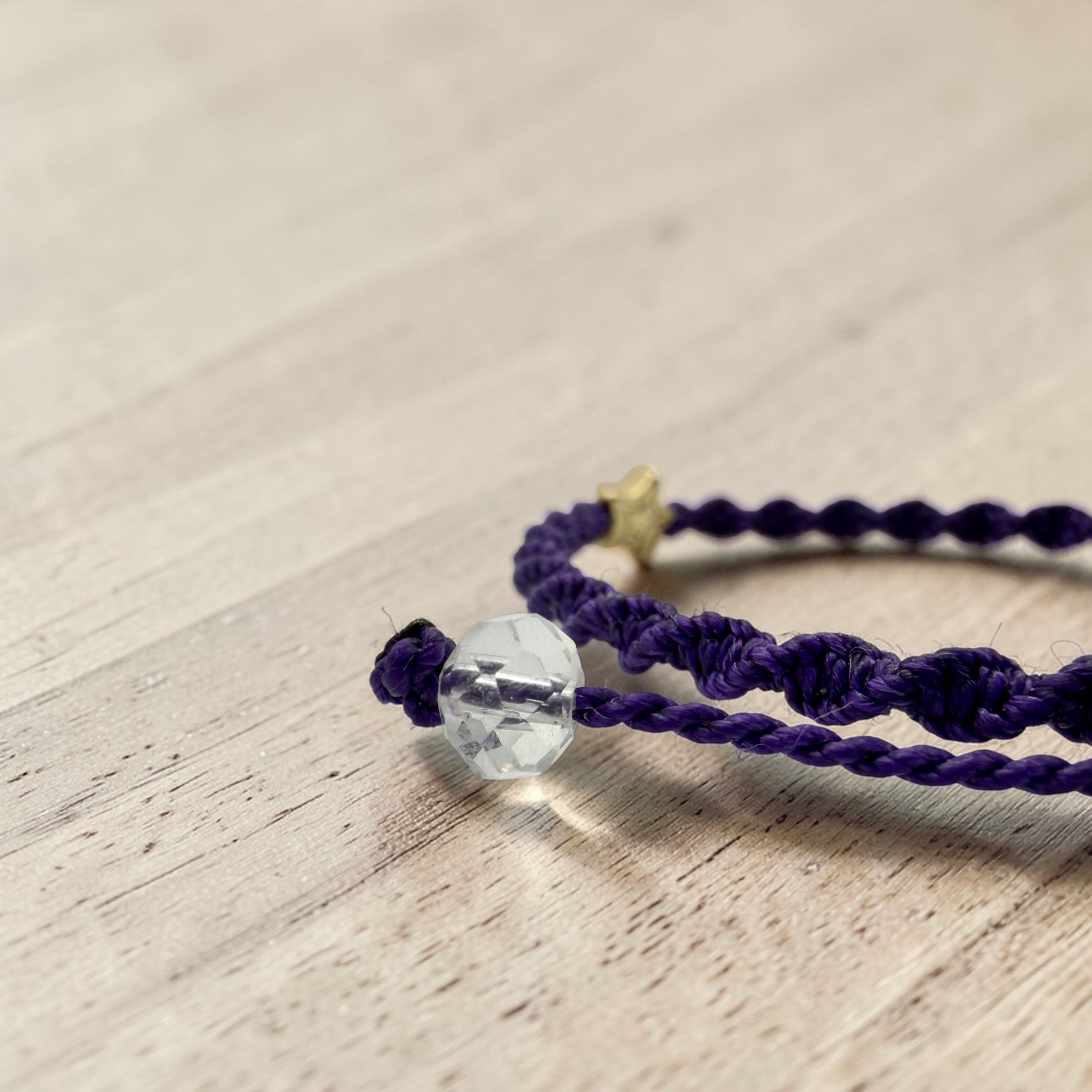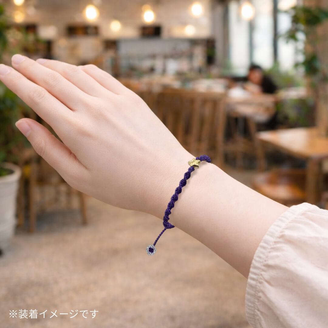 青みを帯びたバイオレットの紐に、小さな星のきらめきを添えた編みブレスレットです。