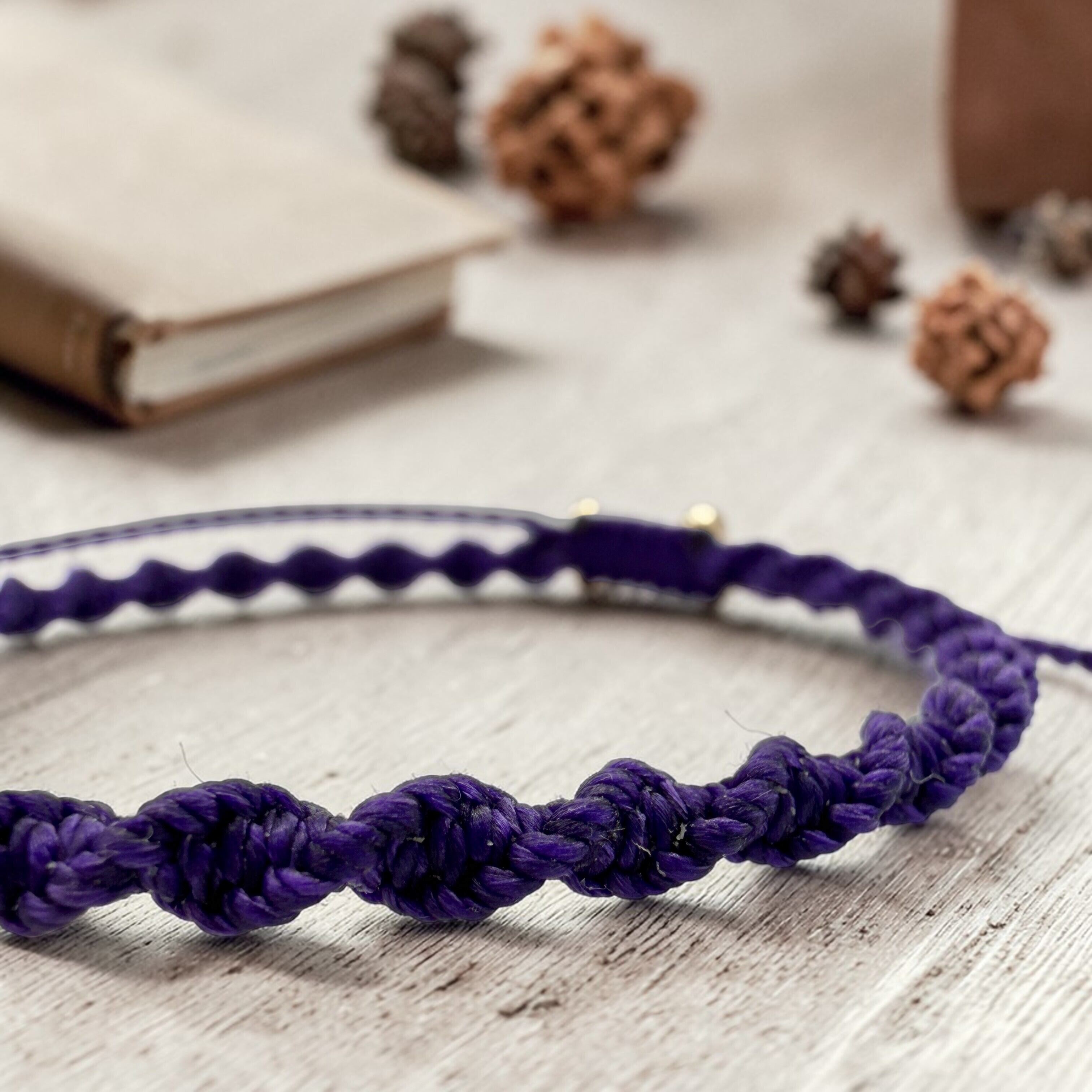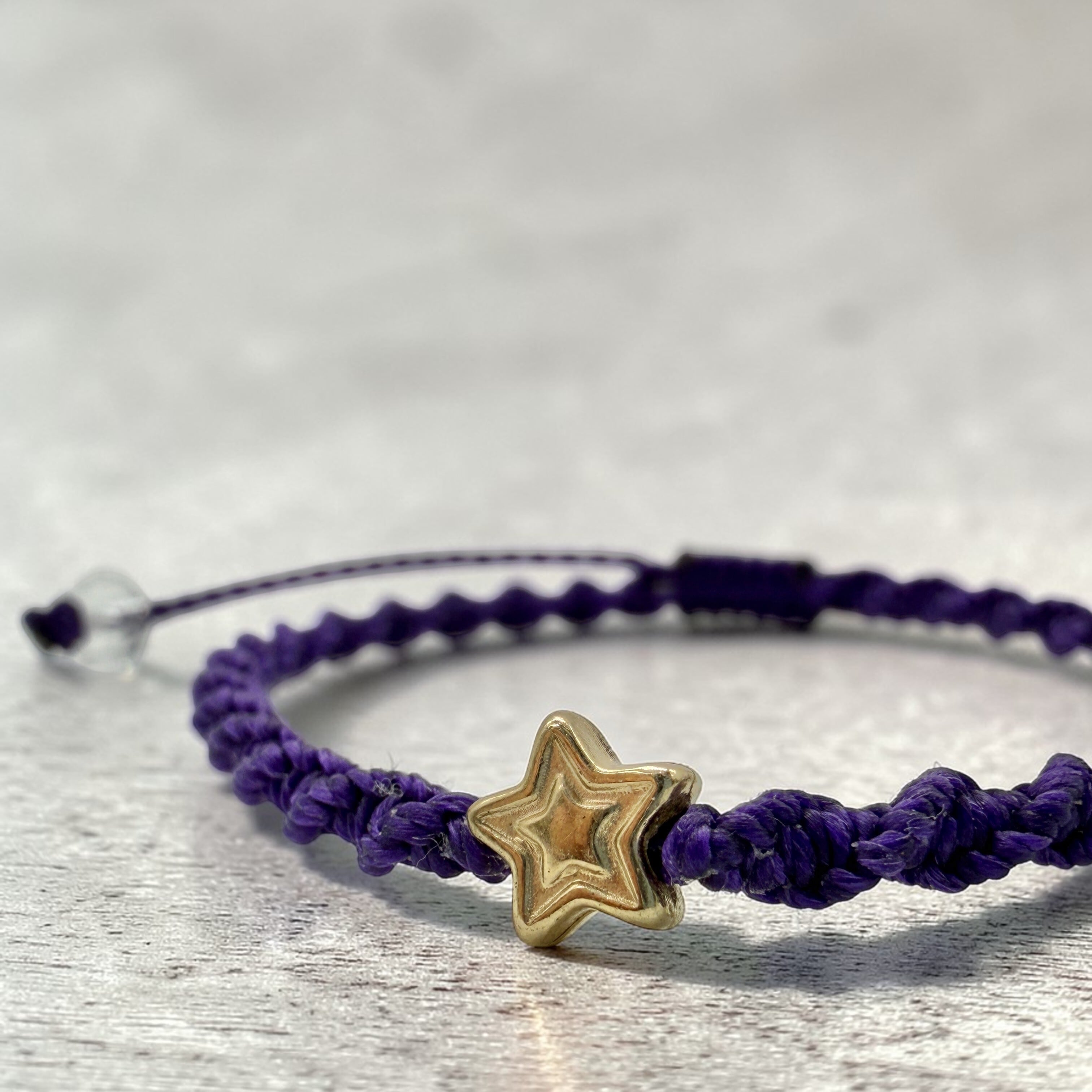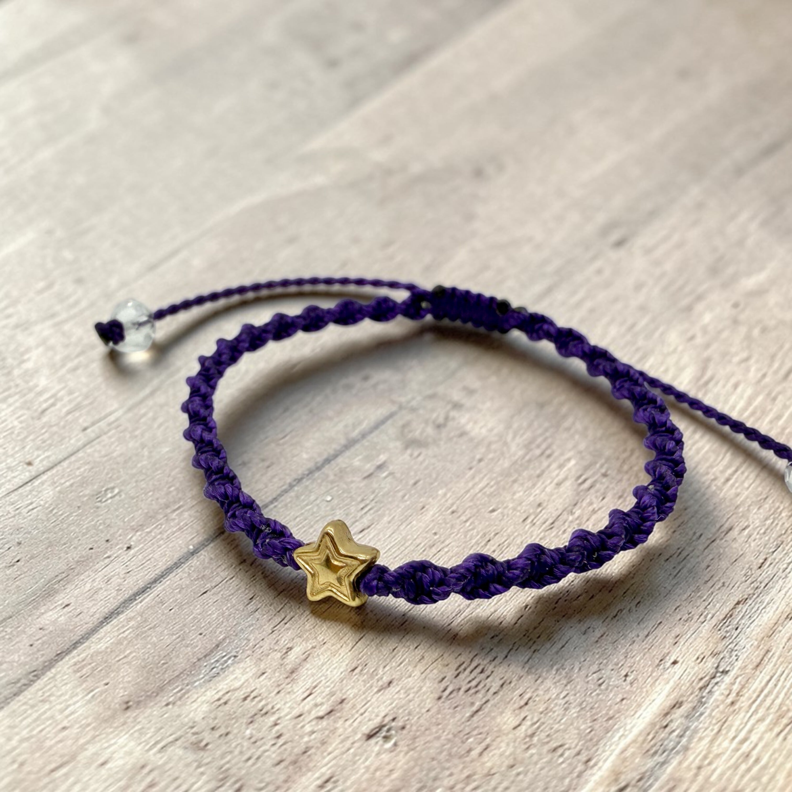 青みを帯びたバイオレットの紐に、小さな星のきらめきを添えた編みブレスレットです。