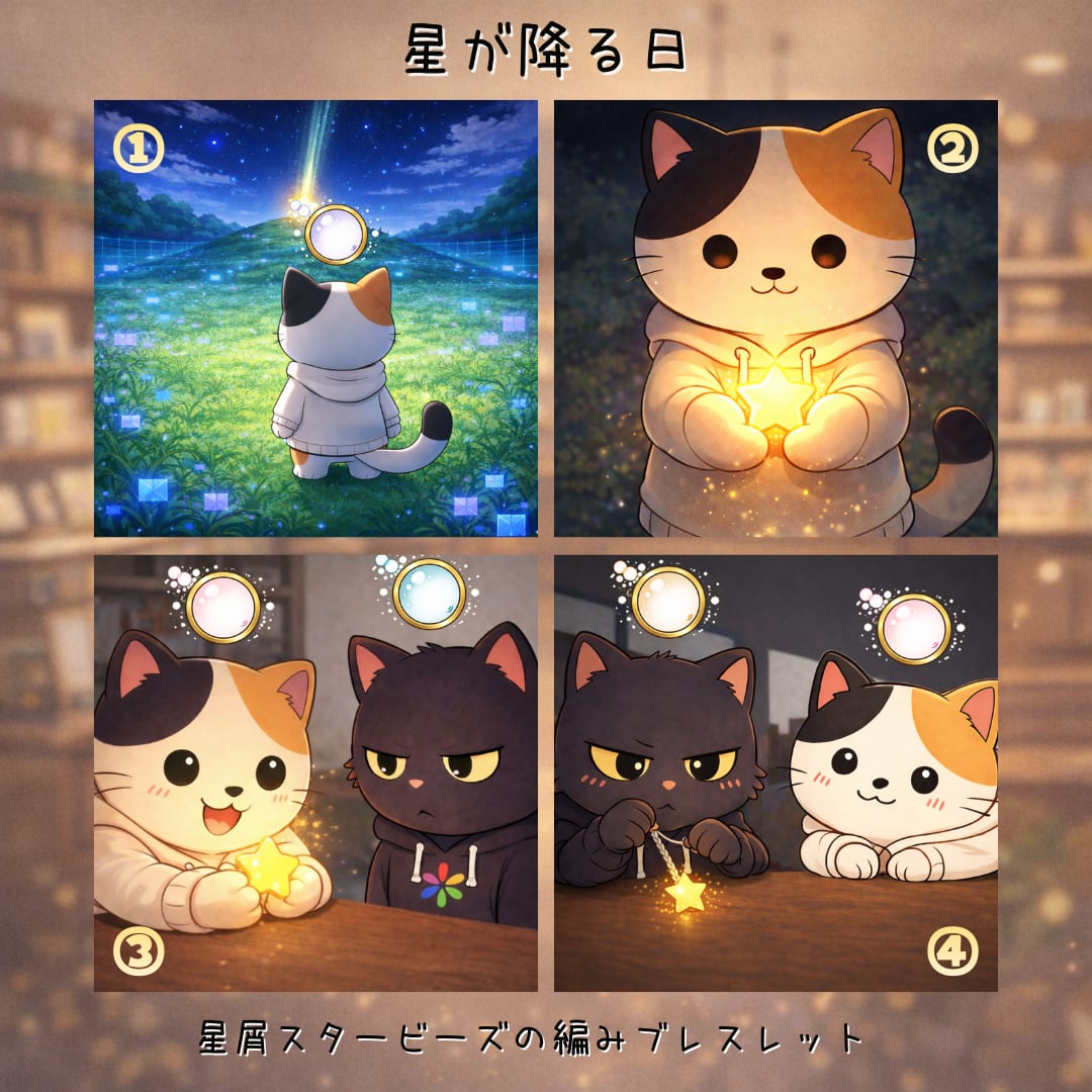 もなかが野原で見つけた星屑を、おこげがアクセサリーへ仕立てた——