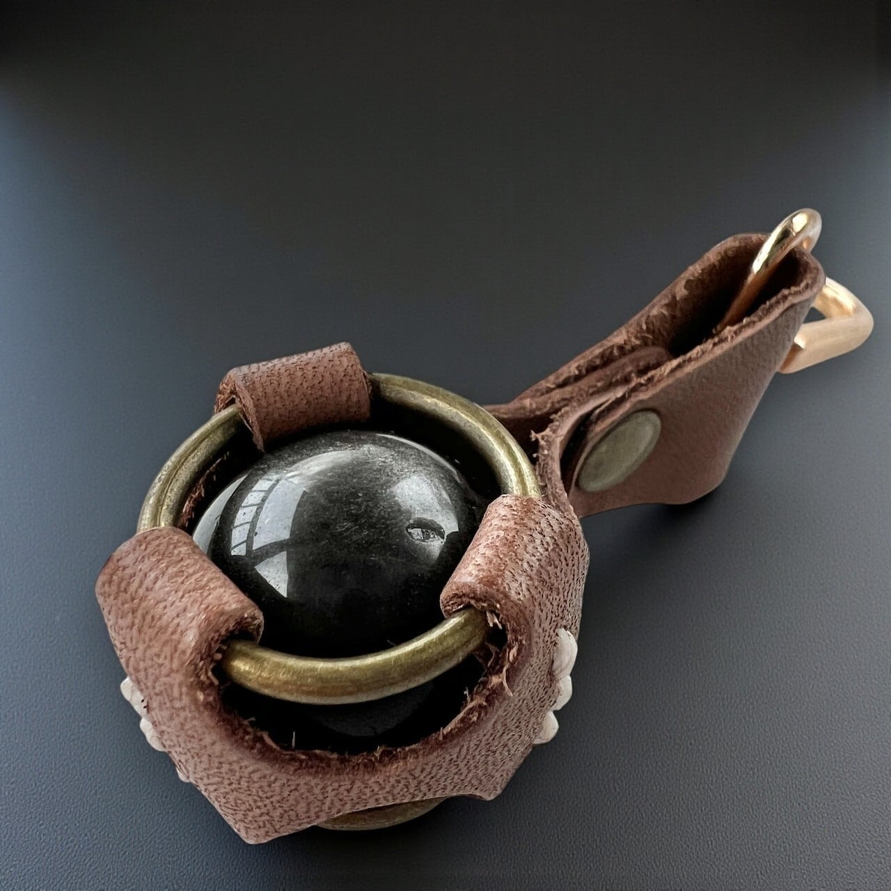 角度によって銀光が揺れるシルバーオブシディアンを本革で包んだキーホルダー。