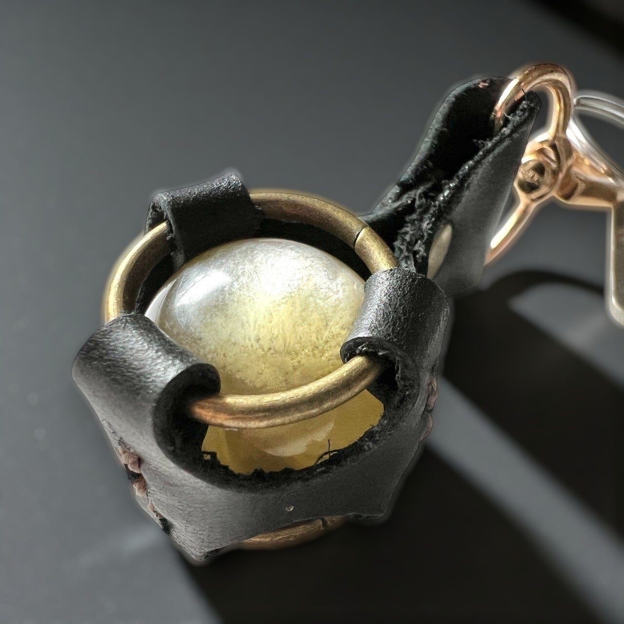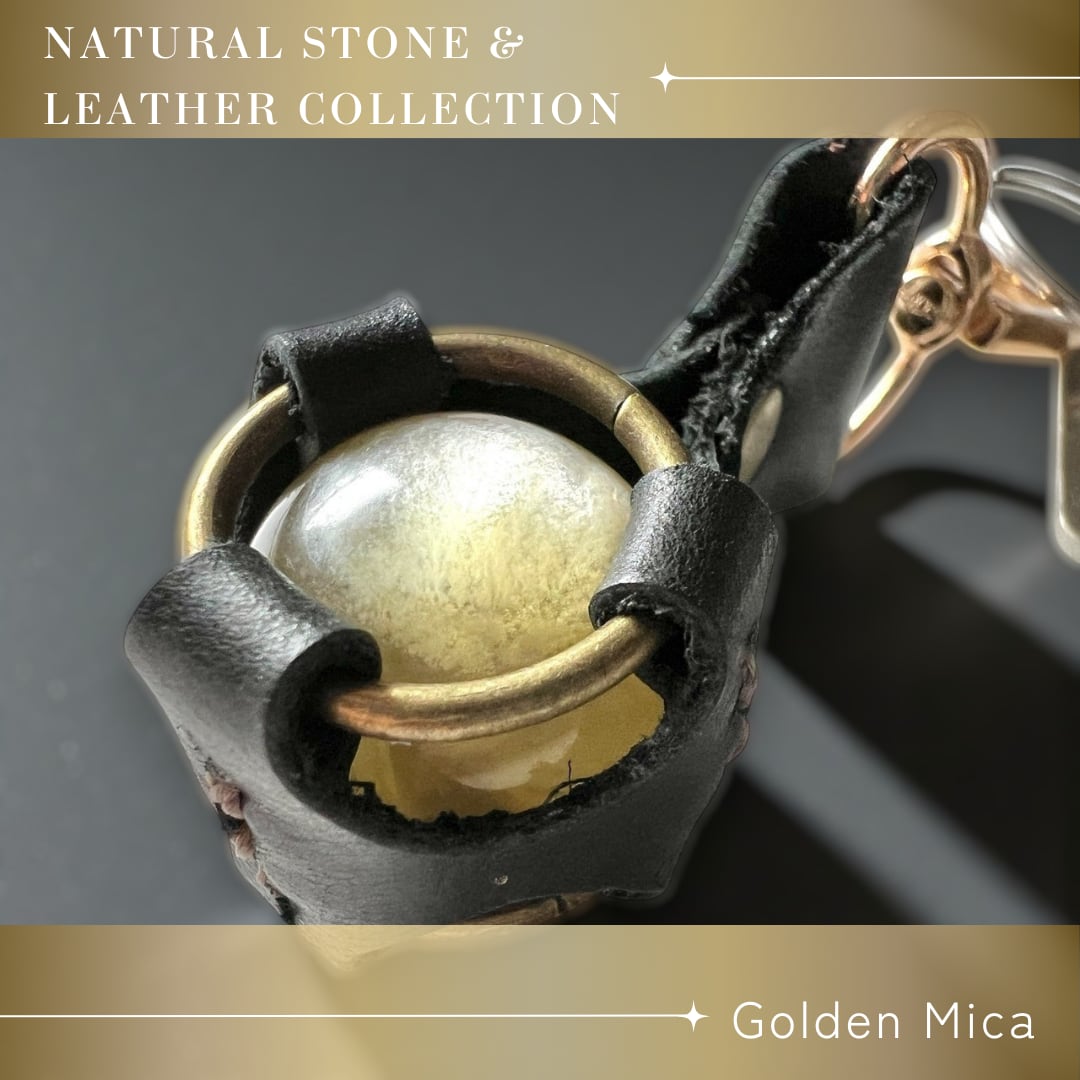 温かく輝くゴールデンマイカ(黄雲母)の丸玉を、本革レザーで包み込んだ一点もののキーホルダーです。手のひらサイズでも存在感があり、光を受けるたびにきらめく表情が楽しめます。